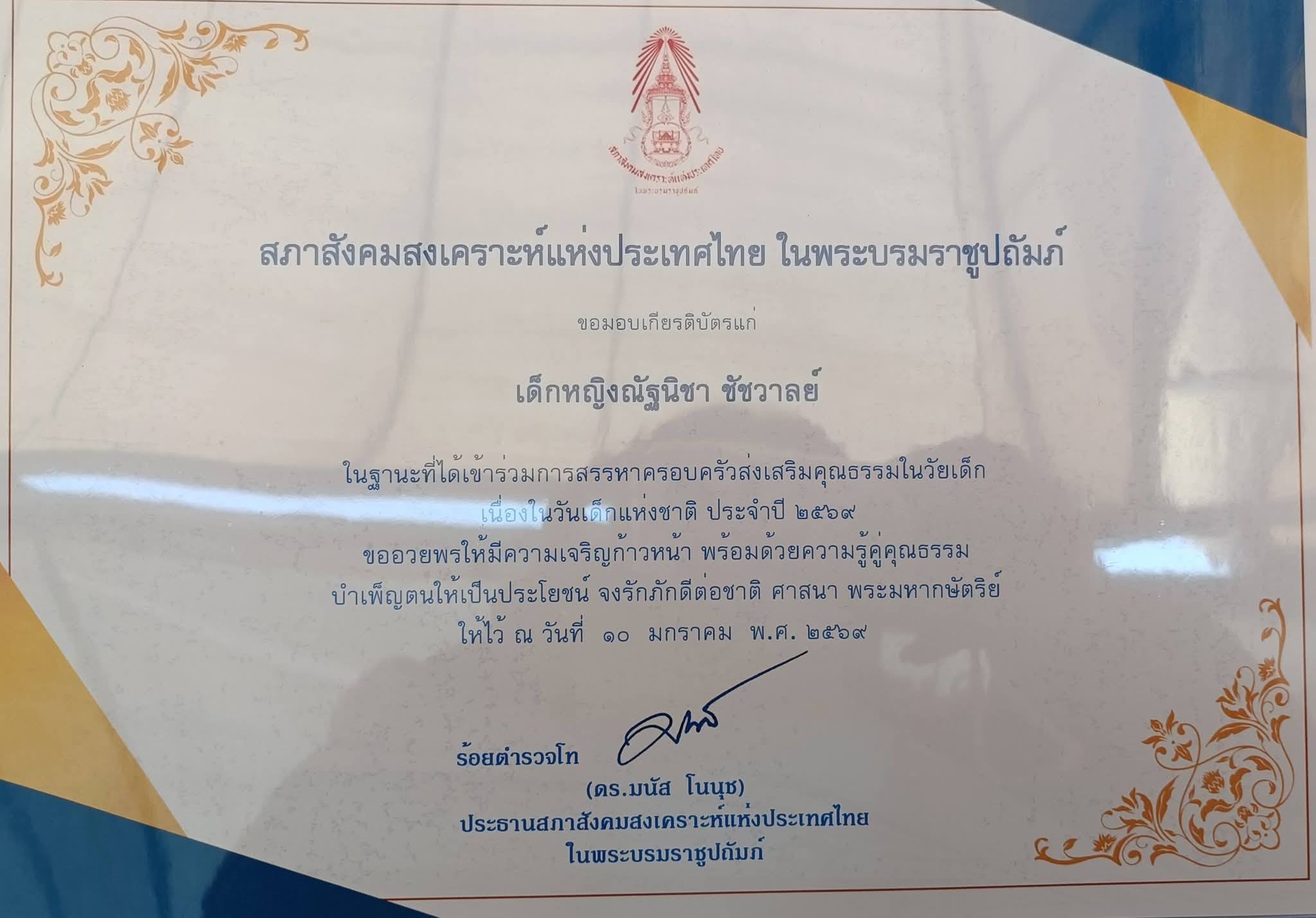 ด้รับรางวัลเข้าร่วมการสรรหาครอบครัวส่งเสริมคุณธรรมในวัยเด็ก จากสภาสังคมสงเคราะห์แห่งประเทศไทย ในพระบรมราชูปถัมภ์ โดยรับมอบจากผู้ว่าราชการจ.เลย วันที่10 ม.ค 2569