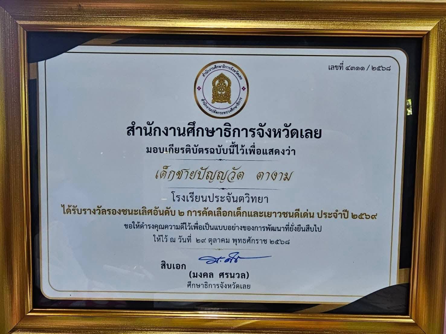 างวัลรองชนะเลิศอันดับ 2 ในการคัดเลือกเด็กและเยาวชนดีเด่น ประจำปี 2569 พร้อมทั้งได้รับใบประกาศโดยท่านรองผู้ว่าราชการจังหวัดเลย นายกิตติคุณ บุญคุณ ในการประชุมคณะกรรมการจังหวัดและหัวหน้าส่วนราชการ วันที่ 24 พฤศจิกายน 2568