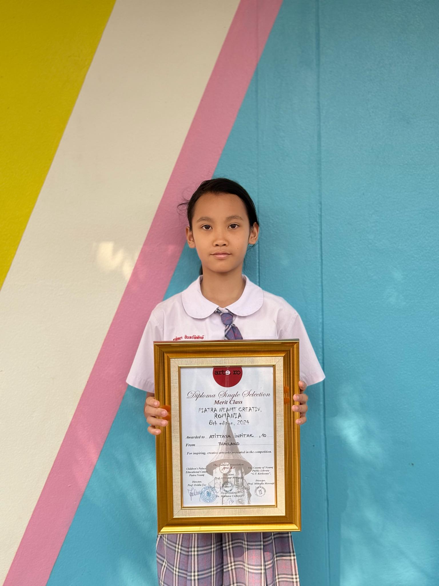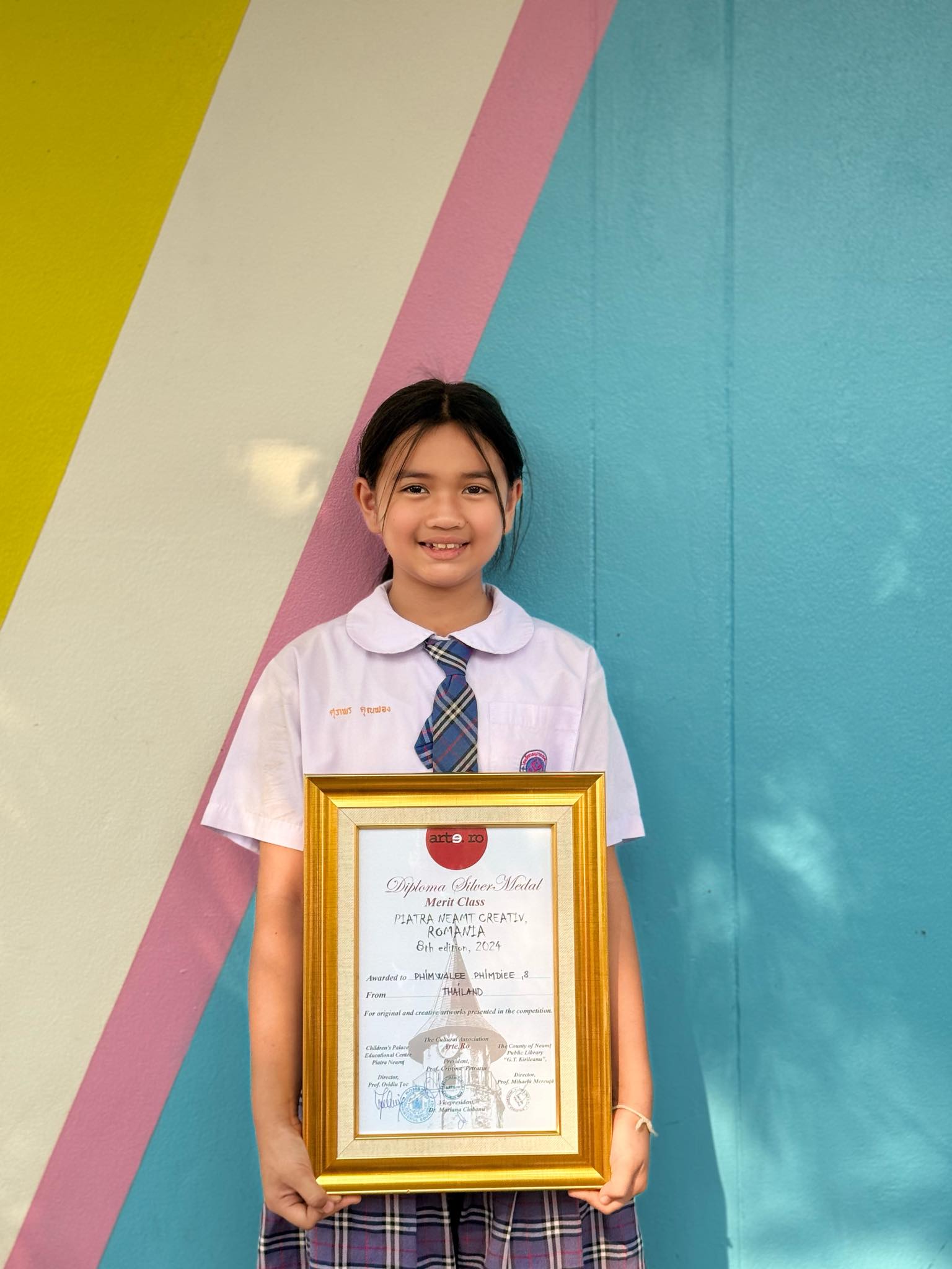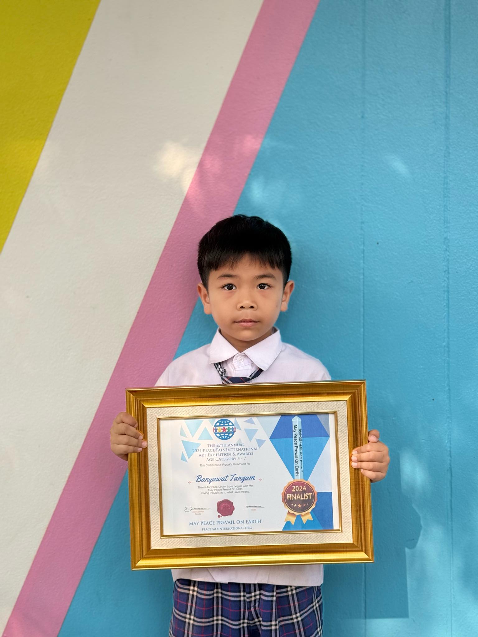 ชื่อผลงาน : ได้รับรางวัลในรายการแข่งขัน THE 27TH ANNUAL2024 PEACE PALS INTERNATIONAL ART EXHIBITION & AWARDS AGE CATEGORY 5 - 7 ผู้ฝึกสอน นายบัญชา ตางาม (ครูเค้ก)
